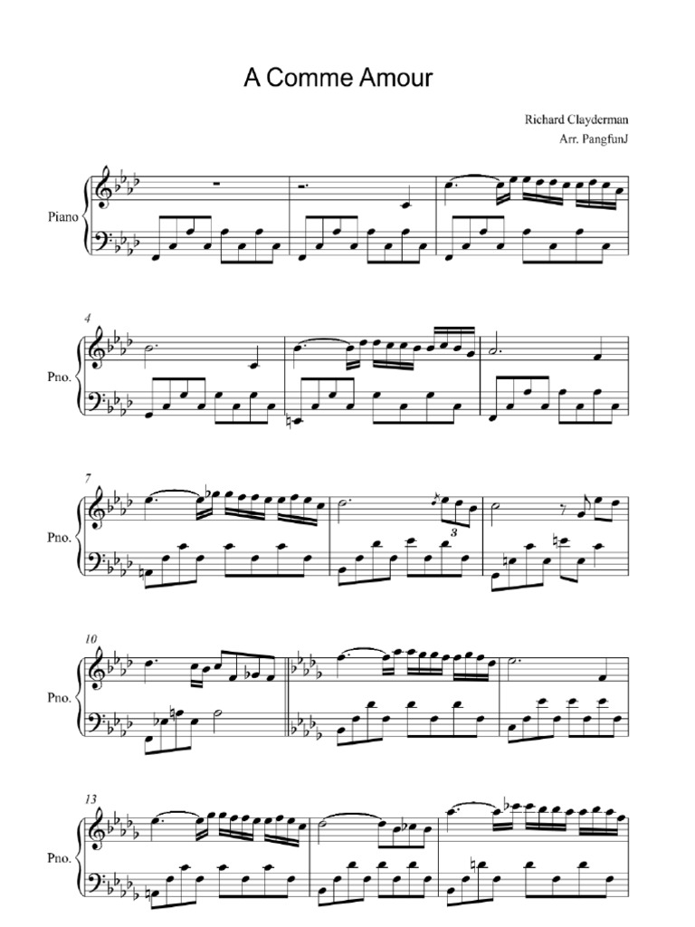 Description. Piano sheet music for the song "A Comme Amour", author "Richard Clayderman". Content: Score for piano and voice. Free download in PDF. Filetype. pdf. Size. 1.44 MB.