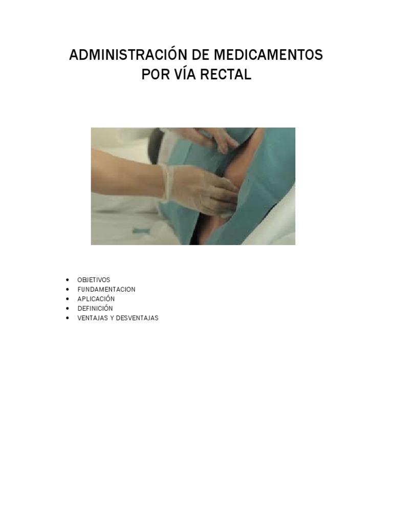 Procedimiento actualizado en 2022. Este procedimiento pretende documentar las acciones que se van a realizar para la administración segura y eficaz de los medicamentos por vía rectal con fines terapéuticos, preventivos o diagnósticos. La vía rectal es anatómicamente el segmento terminal del tubo digestivo (15-19 cm).