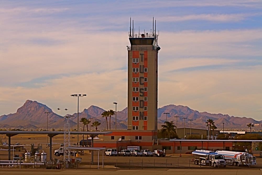 Tucson International Airport tower with jet in background Airport Tower, International Airport