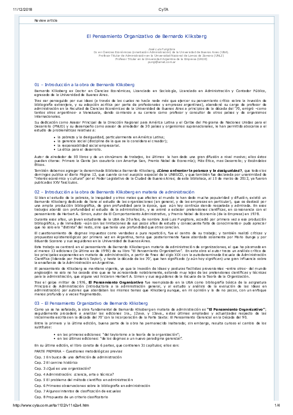 (PDF) El Pensamiento Organizativo de Bernardo Kliksberg (Pungitore).pdf José Luis Pungitore