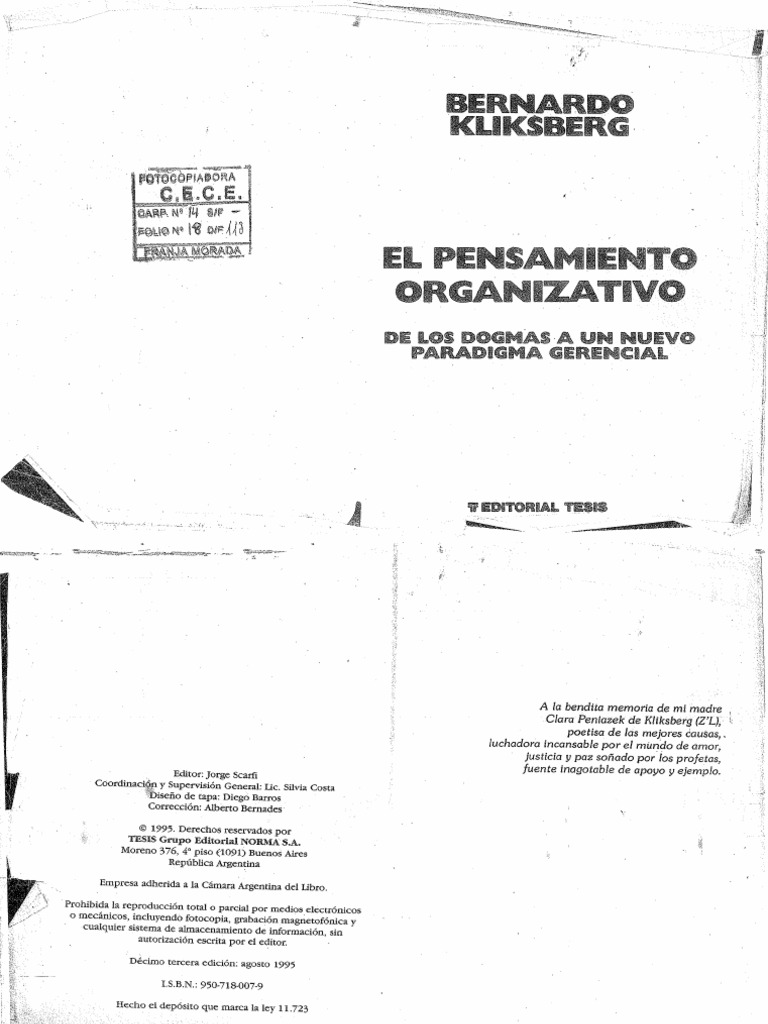 03 - El Pensamiento Organizativo de Bernardo Kliksberg Como ya se ha señalado, la obra fundamental de Bernardo Kliksberg en materia de administración es "El Pensamiento Organizativo"; seguidamente procederé a analizar las ediciones 1ra., 12ava. y 13ava., estas últimas ampliadas y actualizadas respecto de las inicialmente escritas en.