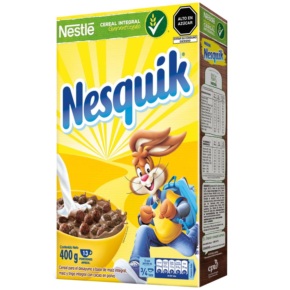 Características y detalles. ¡Cereal Nesquik! Está hecho con todos los beneficios del Cereal Integral y proporciona 10 vitaminas y minerales esenciales, incluyendo hierro, calcio, además tiene menos de 10 g de azúcar por porción. En Nestlé creemos que todos los niños tienen potencial, por eso los cereales Nesquik pueden ayudar a.