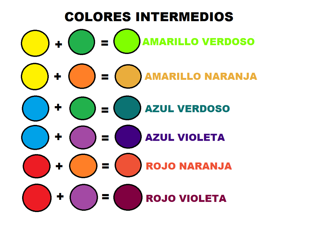 Colores terciarios. Los colores terciarios se generan con la unión de uno primario y uno secundario que se encuentre específicamente al lado del primario en el círculo cromático. Rojo + Naranja = Rojo Anaranjado. Amarillo + Naranja = Amarillo Anaranjado. Azul + Verde = Azul Verdoso. Rojo + Morado = Rojo Violáceo.