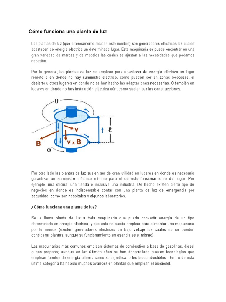 Cómo funciona una planta de luz. Las plantas de luz (que erróneamente reciben este nombre) son generadores eléctricos los cuales abastecen de energía eléctrica un determinado lugar. Esta maquinaria se puede encontrar en una gran variedad de marcas y de modelos las cuales se ajustan a las necesidades que podamos necesitar.