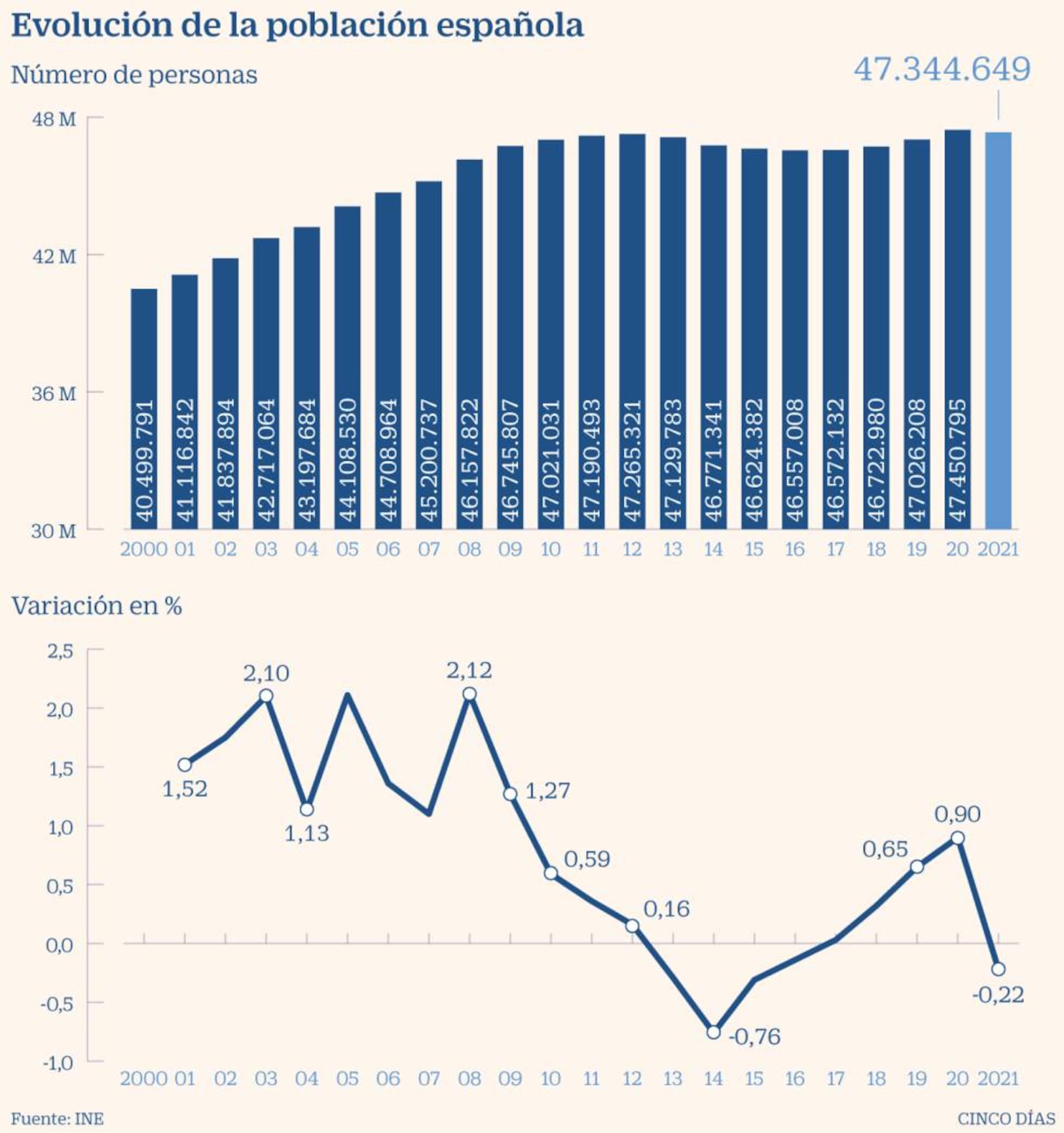 La población en España se redujo en 106.000 personas en 2020, el mayor descenso desde 2015