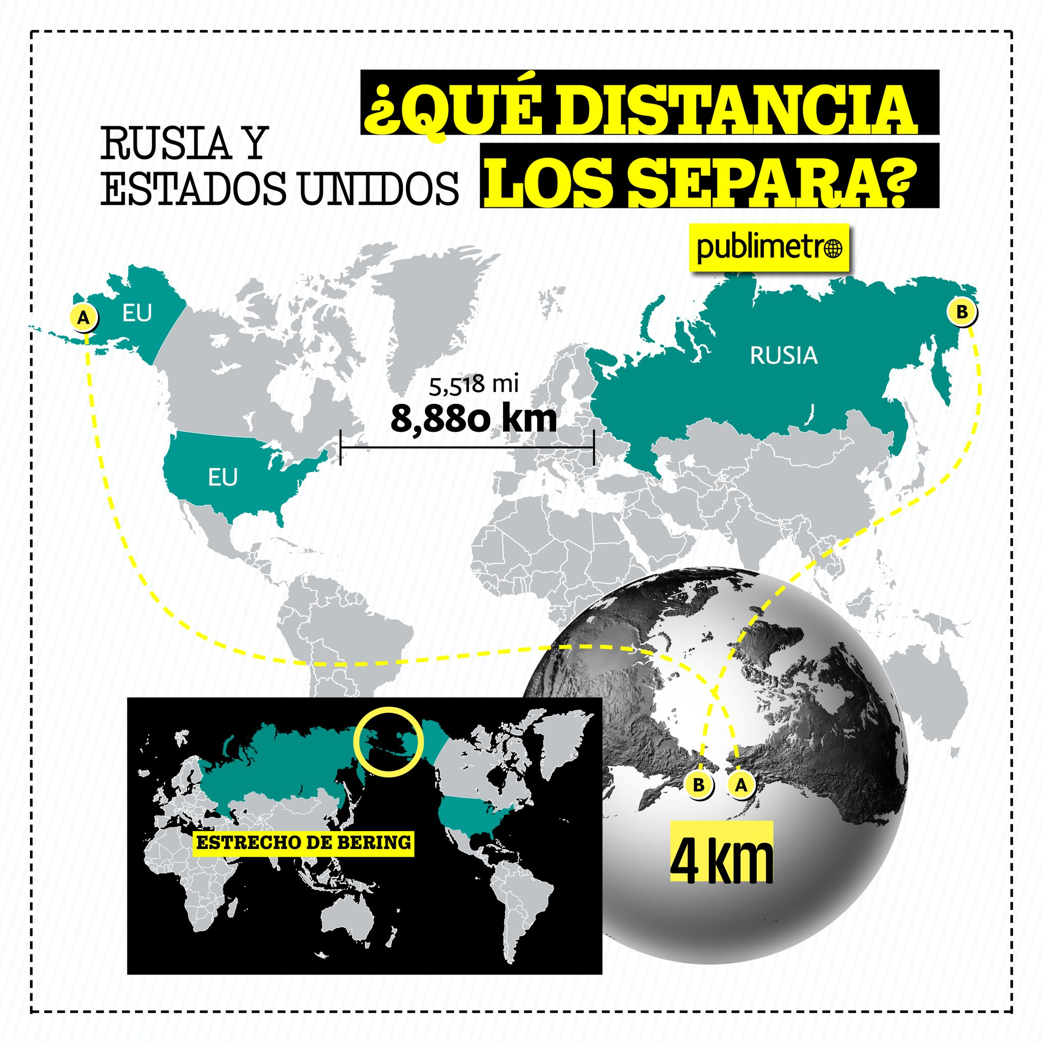 De acuerdo con alaskacenters.gov, la distancia más estrecha entre Rusia continental y Estados Unidos continental (por Alaska) es de aproximadamente 55 millas. Sin embargo, en el cuerpo de agua entre Alaska y Rusia, conocido como el Estrecho de Bering, se encuentran dos pequeñas islas conocidas como Big Diomede, propiedad de Rusia, y Little.