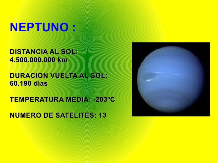 Distancia media al Sol, 10 6 km: 4.500: Densidad (agua=1) 1,67: Gravedad superficial m/s 2: 11,0: Moons: Neptuno es en tamaño casi gemelo a Urano, uno de los gigantes de gas. Neptuno se descubrió matemáticamente, antes de verse con el telescopio.. llevándola desde 1,4 a 9,7 millones de kilómetros de Neptuno. Nereida fue descubierta en.
