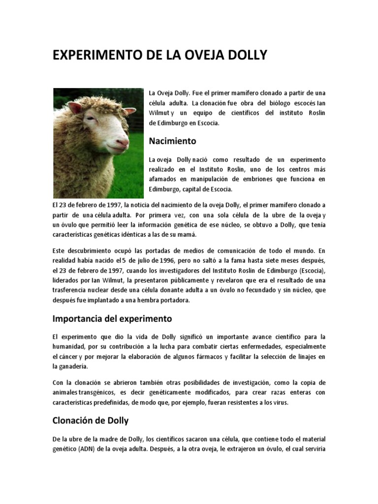 Así fue el experimento para clonar a la oveja Dolly. El 5 de julio de 1996 nació la oveja Dolly, el primer mamífero clonado a partir de una célula adulta. Su nacimiento, en 1996, no fue.