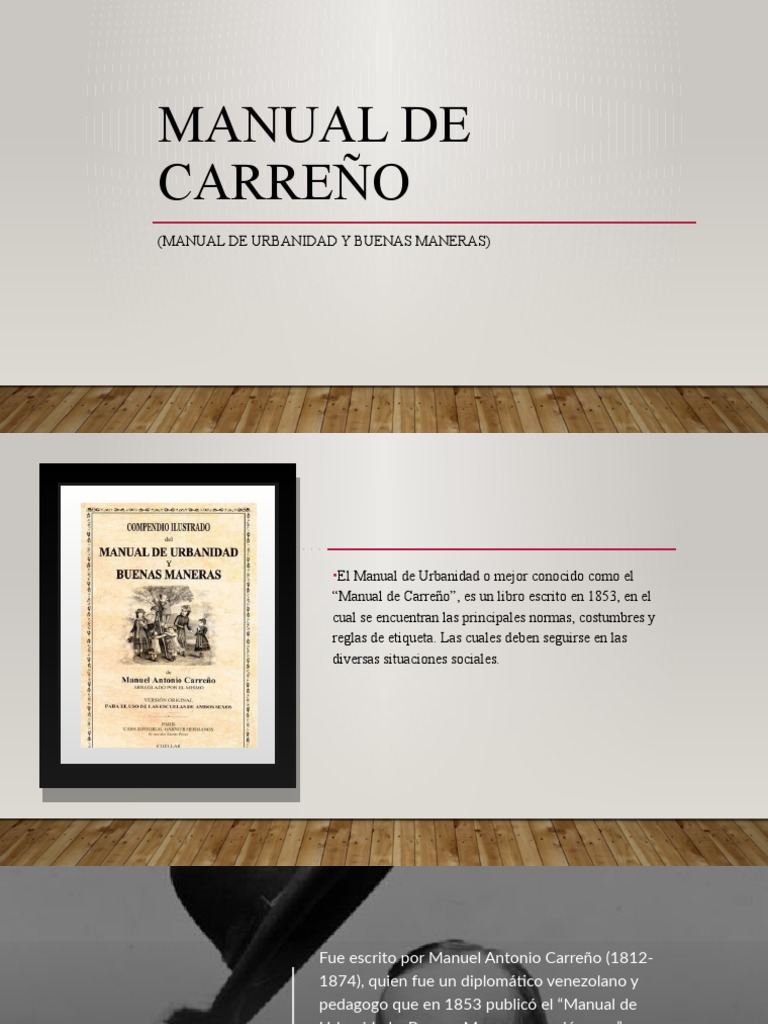 El Manual de Carreño: descarga gratuita PDF. El Manual de Carreño, también conocido como "Manual de Urbanidad y Buenas Maneras", es una obra clásica de la etiqueta social y los buenos modales. Escrito por el venezolano Manuel Antonio Carreño en 1853, este libro se ha convertido en una referencia invaluable para aquellos interesados en.