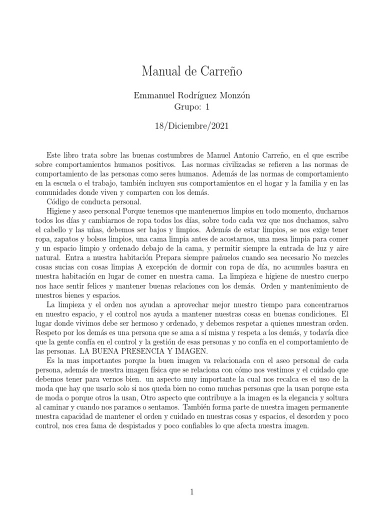 ENSAYO SOBRE EL MANUAL DE CARREÑO DADIER, DANIELA, JORDIN Y JUAN DAVID PDF Sociedad