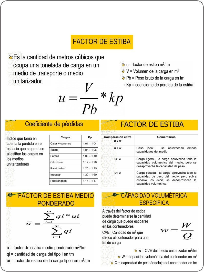 Calcular el flete del transporte marítimo internacional: qué tener en cuenta. Esta relación peso/volumen de la cotización de transporte marítimo se conoce como factor de estiba. Para obtener este factor se aplica la fórmula FE = Volumen / Peso, partiendo de la base de que FE= M3 /TM (siendo M3 el metro cúbico y TM la tonelada métrica).