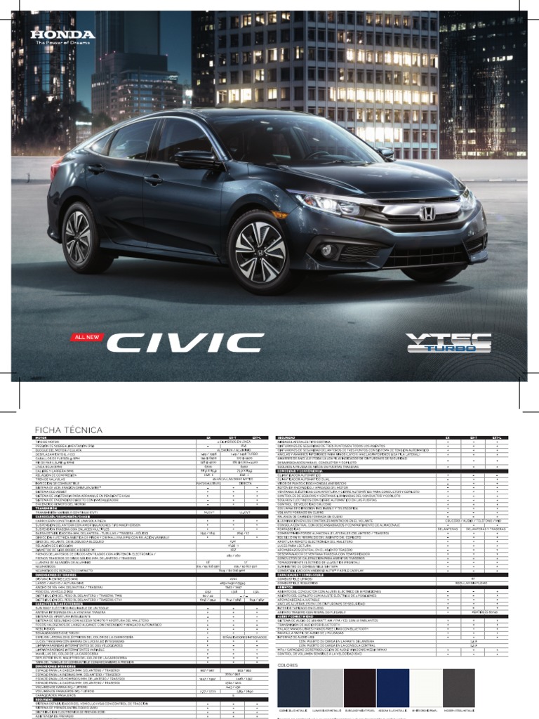 FICHA TÉCNICA. Motor de aleación de aluminio. i-STYLE SPORT TOURING TRANSMISIÓN i-STYLE SPORT TOURING. Desplazamiento del motor (centímetros cúbicos) 4 Cilindros en Línea 2.0 Litros de 16 válvulas DOHC i-VTEC Potencia neta: 155 hp @ 6,500 rpm* Torque neto: 136 lb/pie @ 4,200 rpm* 4 Cilindros en Línea 1.5 Litros Turbo coninyección.