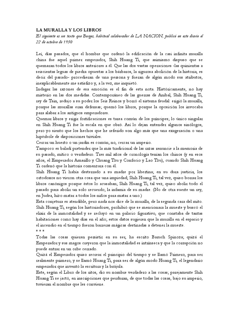 Pages:4. Preview. Full text. La Muralla y Los Libros - BorgesLeí, días pasados, que el hombre que ordenó la edificación de la casi infinita muralla china fue aquel primer emperador, Shih Huang Ti, que asimismo dispuso que se quemaran todos los libros anteriores a él. Que las dos vastas operaciones -las quinientas a seiscientas leguas de.