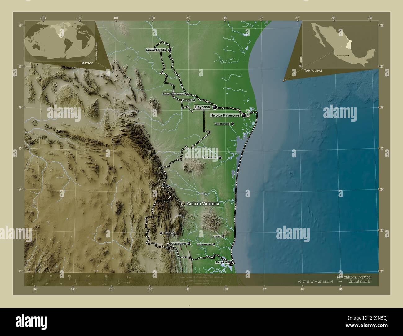 Tamaulipas, estado de México. Mapa de altura coloreado en estilo wiki con lagos y ríos. Lugares