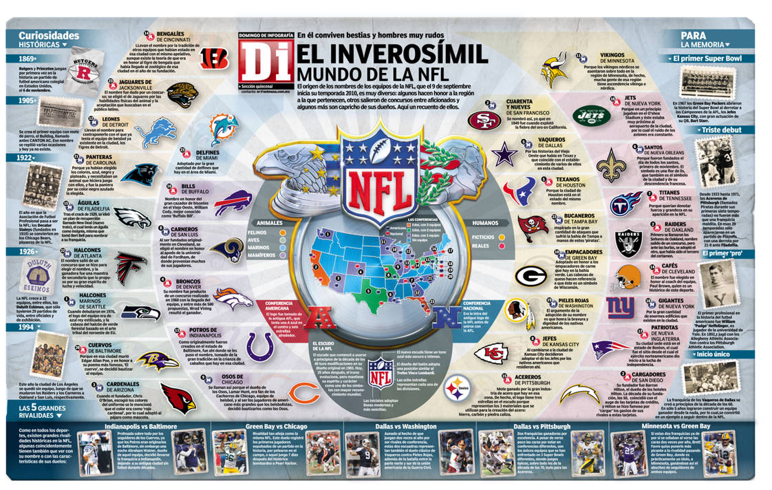Los equipos de la NFL están divididos en dos conferencias: la Conferencia Americana (AFC) y la Conferencia Nacional (NFC), que a su vez se dividen cada una en cuatro divisiones de cuatro equipos cada una: tenemos 32 equipos en total en la liga de fútbol americano de los Estados Unidos.. La popularidad e importancia que tiene esta liga a nivel internacional se relaciona, primero, con la.