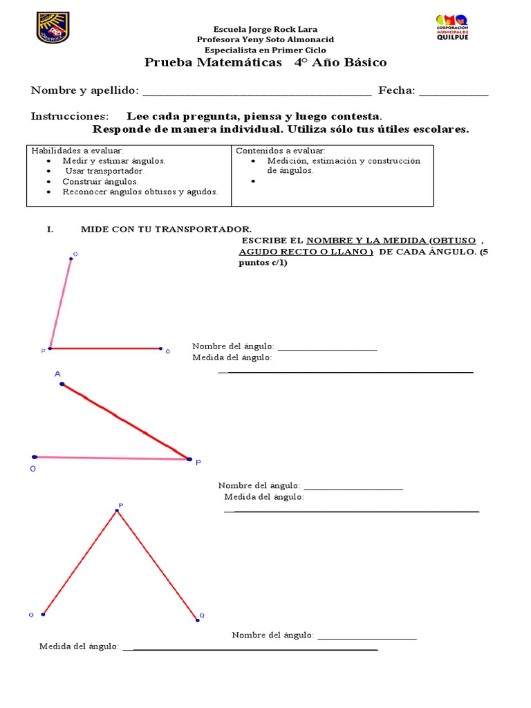 Prueba De Matematicas Cuarto Basico Angulos 2024