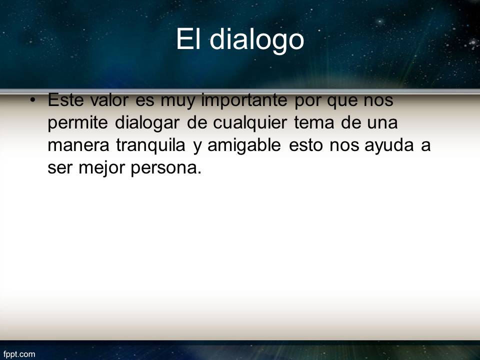 Definición del valor del Diálogo. De acuerdo a los estudios del Lenguaje, el diálogo es el intercambio de opiniones e ideas entre dos o más individuos, realizada de una forma amable, pacífica y orientada al entendimiento mutuo de los involucrados. En cuanto al Diálogo como valor, algunas disciplinas como la Sociología lo identifican a la.