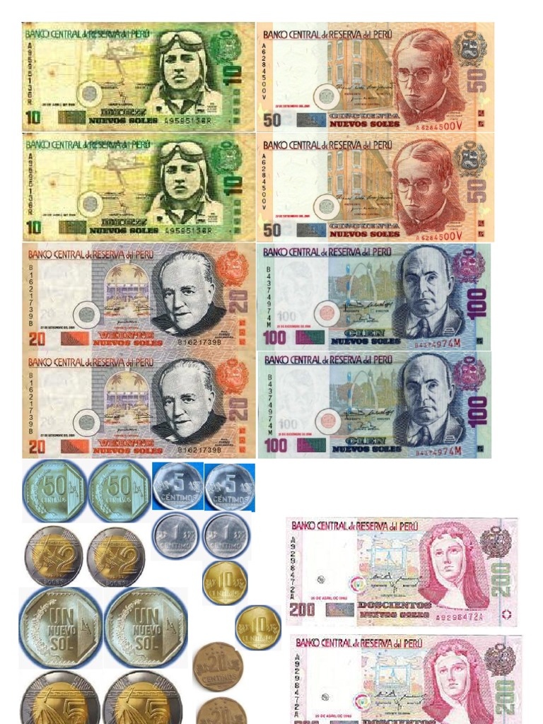 Monedas: de 5 céntimos, 10 céntimos, 20 céntimos; 50 céntimos, 1 sol, 2 soles y 5 soles. Conócelas antes de viajar a Perú para que te familiarices con su dinero. Consejo de Viaje: No pagues de más en el aeropuerto. Si viajas de Miraflores al aeropuerto o viceversa, te recomendamos usar el servicio de lujo Airport Express Lima.