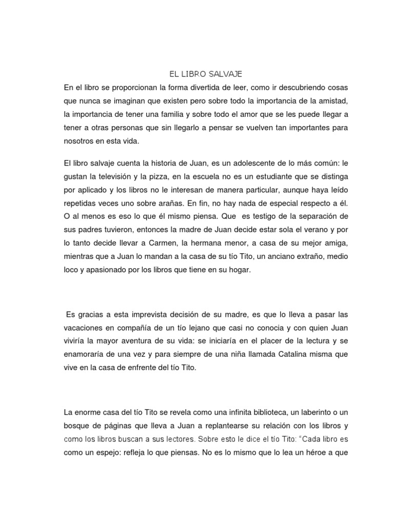 El libro salvaje. Autor Juan Villoro Género Juvenil. Juan ya tiene planeadas las vacaciones de verano. Sin embargo, su madre ignora sus planes y lo deja en casa de tío Tito, un bibliófilo empedernido que come con la boca abierta y adora las arañas porque lo protegen de los mosquitos que lo distraen en sus lecturas.