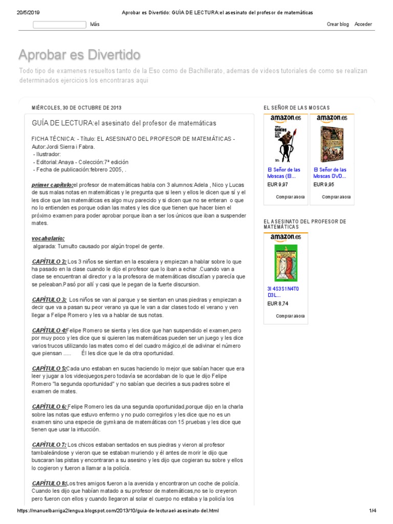 Books. El asesinato del profesor de matemáticas. Jordi Sierra trata de manera divertida y amena el odio que siempre han demostrado tener los jóvenes hacia esta asignatura y halla una fantástica solución al hastío que les produce a los estudiantes. Un profesor propone a sus alumnos un juego como examen para aprobar las matemáticas.